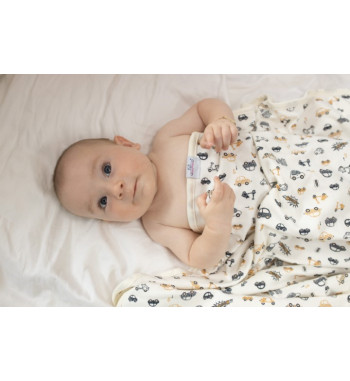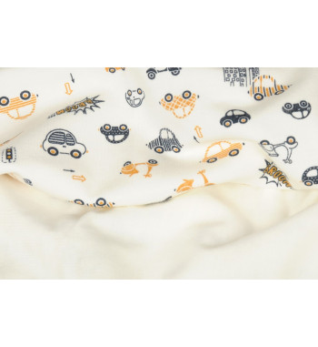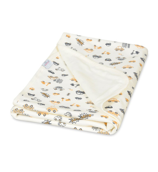 Kocyk dziecięcy INES, roz.75x100cm materiał: JERSEY 100% bawełna- gruby interlock obszyty lamówką, WZÓR autka garbuski + jersey 02
