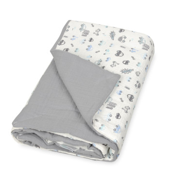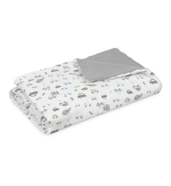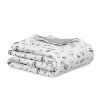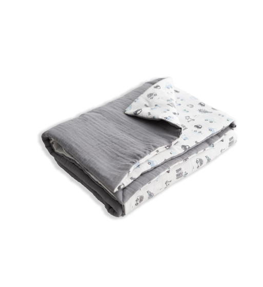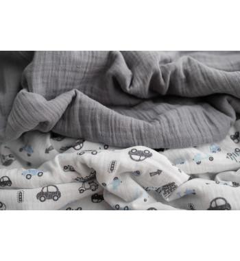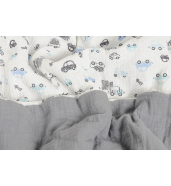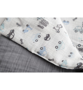 Kocyk dziecięcy MUSLIN DESIGN, roz.75x100cm materiał: MUSLIN 100% bawełna, Wypełnienie: Włóknina silikonowa, muślina dwuwarstwowa wzór autka + muślina 44