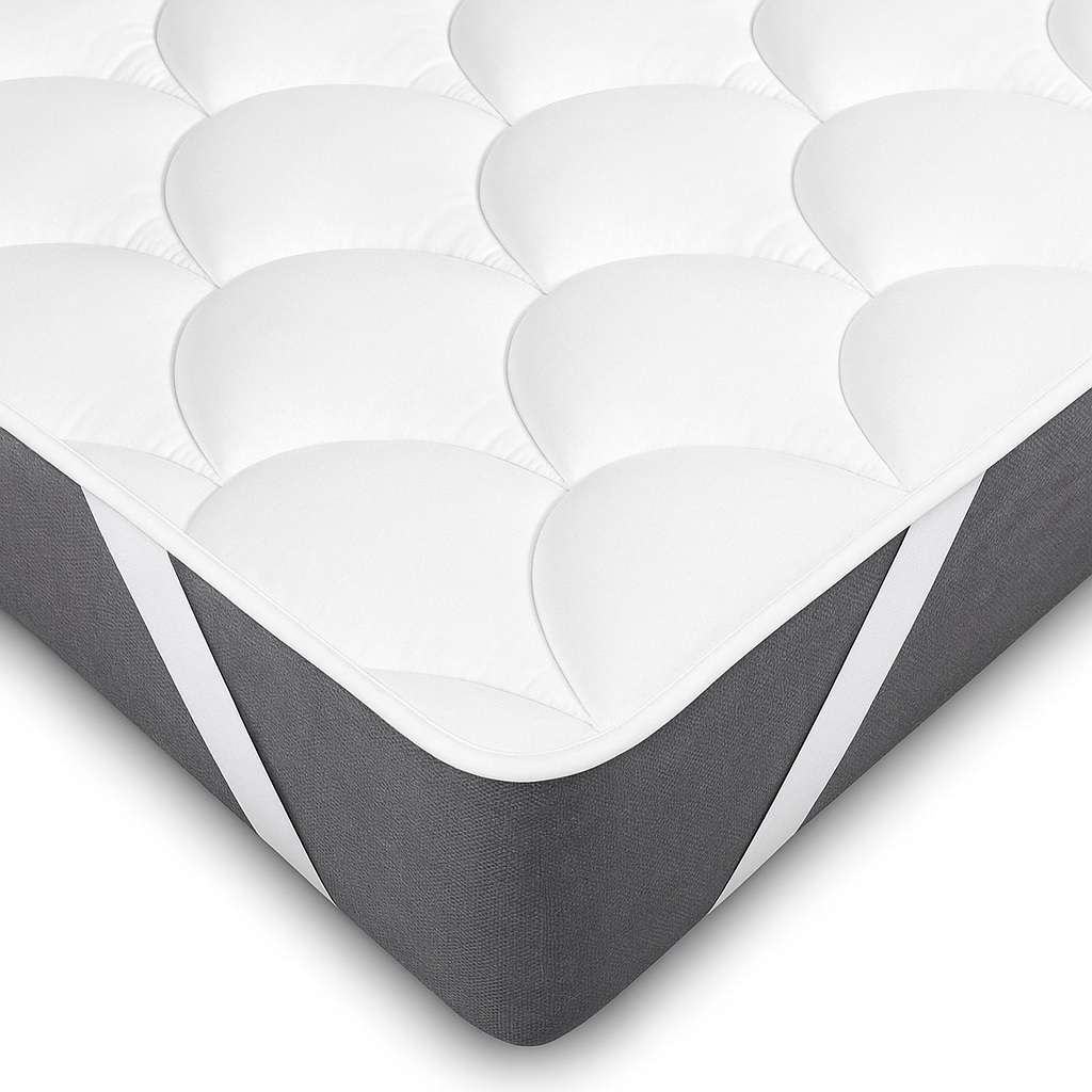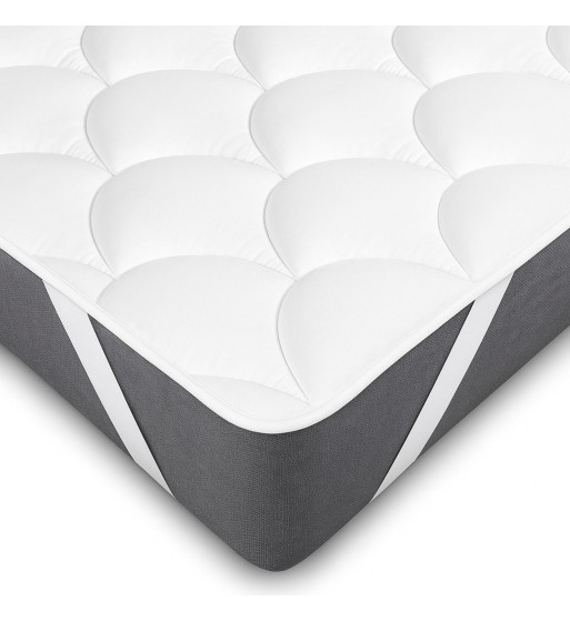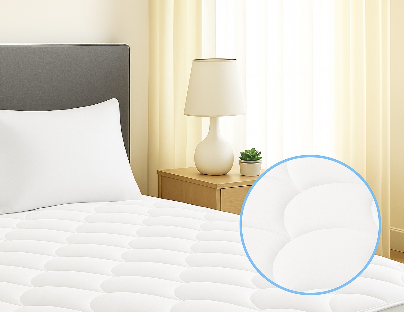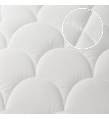 Powierzchnia ochraniacza została elegancko przepikowana w charakterystyczny łukowaty wzór, który nie tylko poprawia wygląd produktu, ale też zapobiega przemieszczaniu się wypełnienia wewnątrz. Starannie obszyta lamówką i wyposażona w cztery elastyczne gumki narożne, dzięki którym ochraniacz stabilnie przylega do materaca i nie przesuwa się nawet przy intensywnym użytkowaniu.