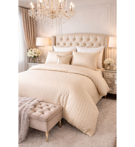 Subtelny wzór w klasyczne pasy nadaje sypialni luksusowy, hotelowy charakter. To prosty sposób, by odświeżyć wnętrze i nadać mu elegancji — bez remontu, bez wysiłku.